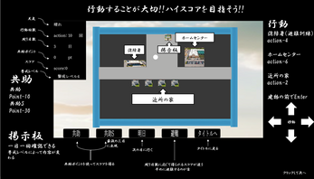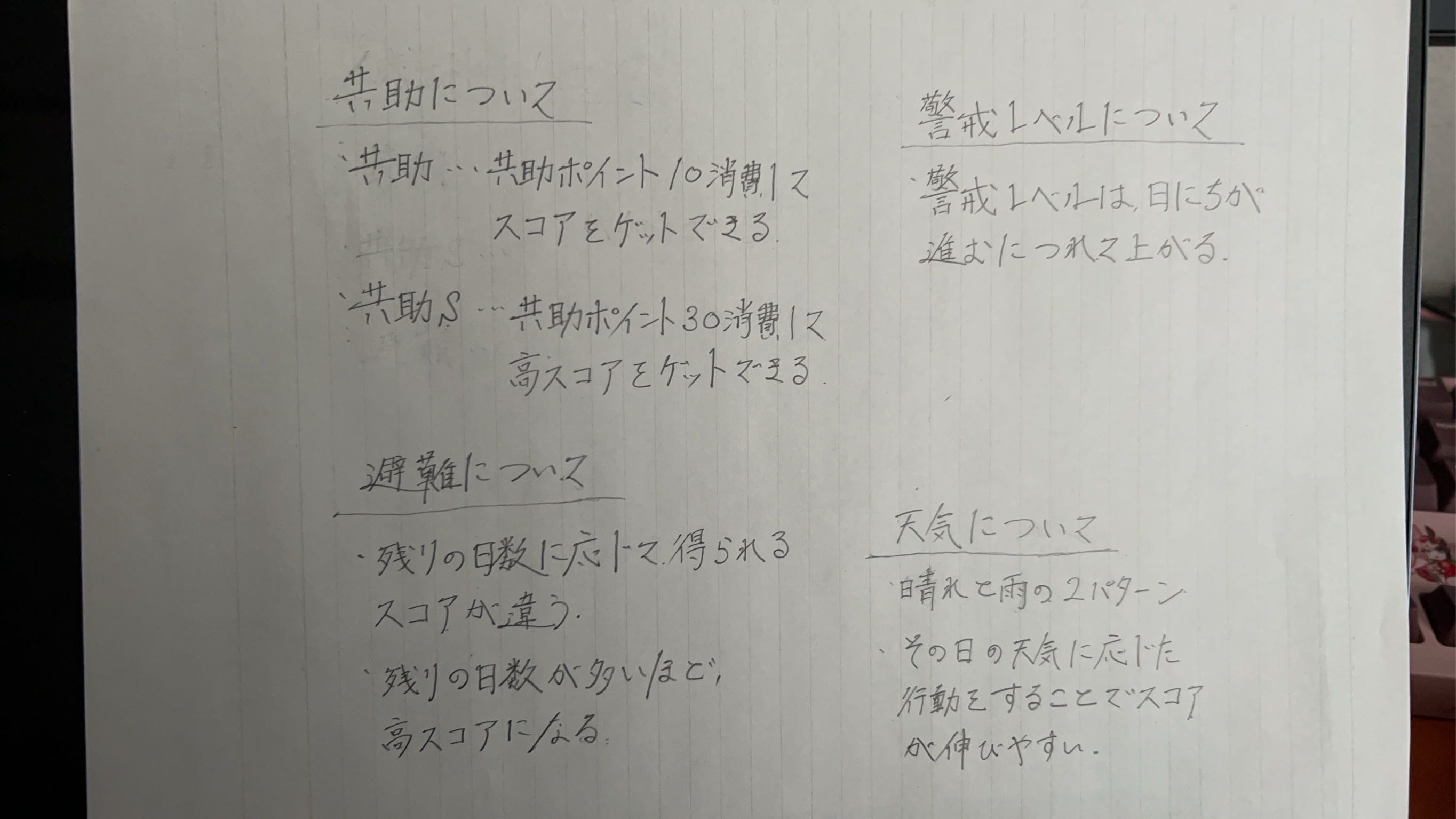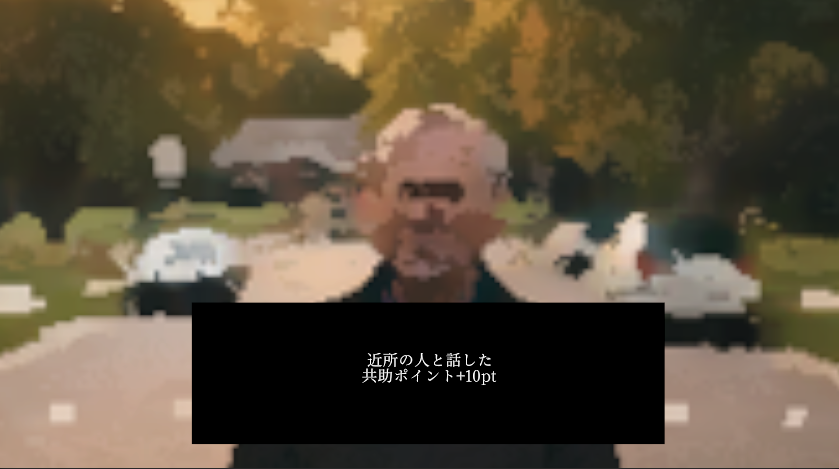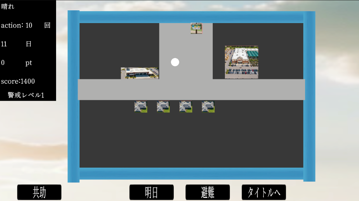 ただし,近所の人の姿が全員同じに見えるため,臨場感がない.また,「共助」ボタンが何を意味しているか,理解できなかった.ゲームの説明画面が最初にあるが,説明の内容をあまり理解することができず,楽しく遊ぶことができなかった点が残念だった.
