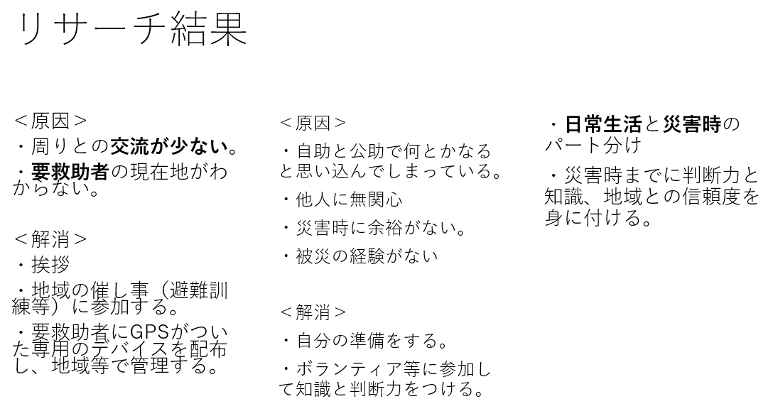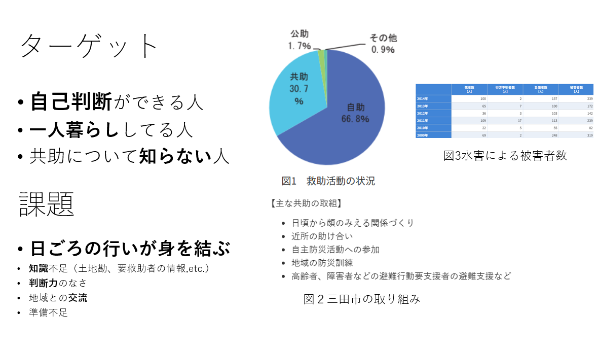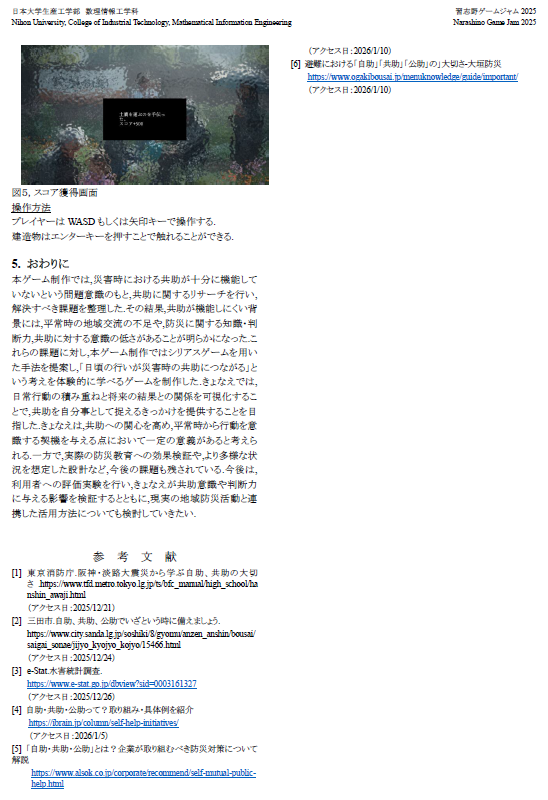 本ゲーム制作では、共助が十分に機能していないという課題に対し、シリアスゲームを用いた手法を提案する。リサーチから、共助が行われにくい背景には、日常的な地域交流の不足や、防災に関する知識・判断力の不足があることが分かった。