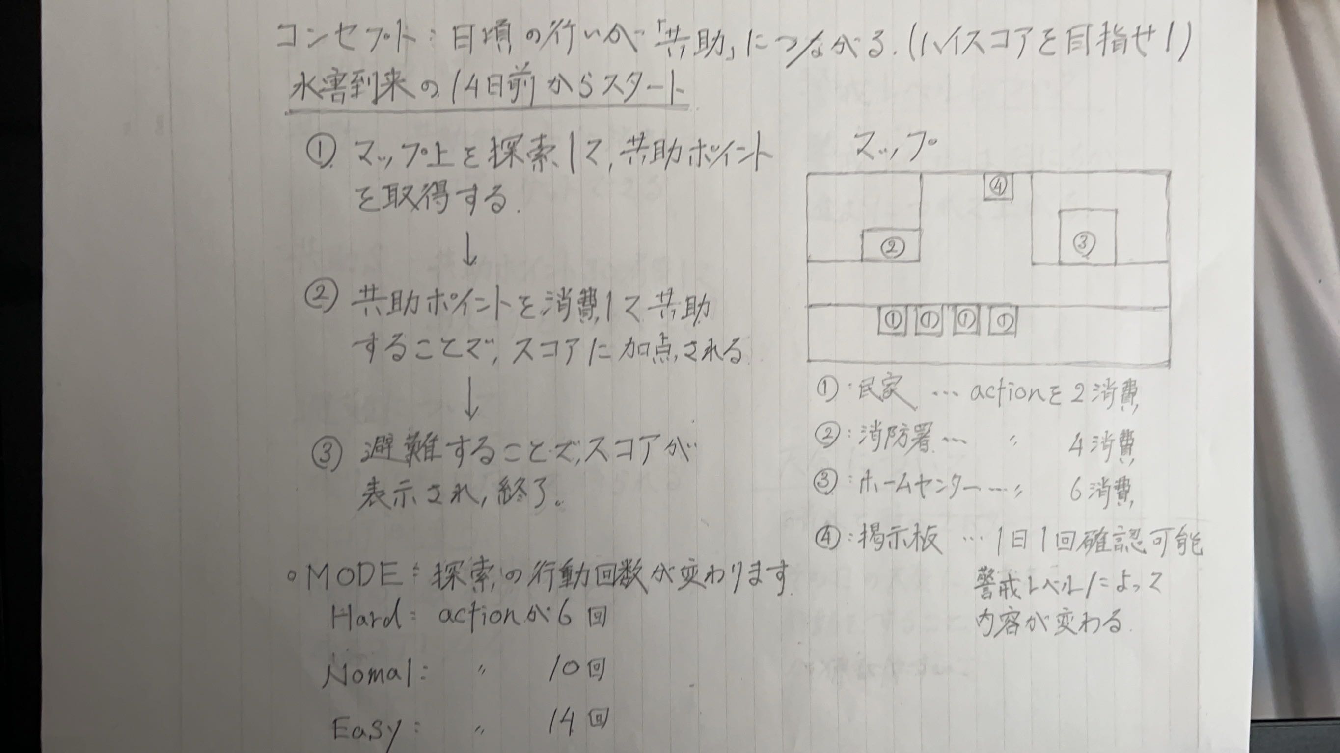 そこで、「日頃の行いが共助につながる」というコンセプトのもと、平常時の行動と災害時の結果が結びつく体験型ゲームを制作した。ゲームの体験性を活かし、行動と結果の関係を可視化することで、共助を自分事として捉えさせることを目的とする。